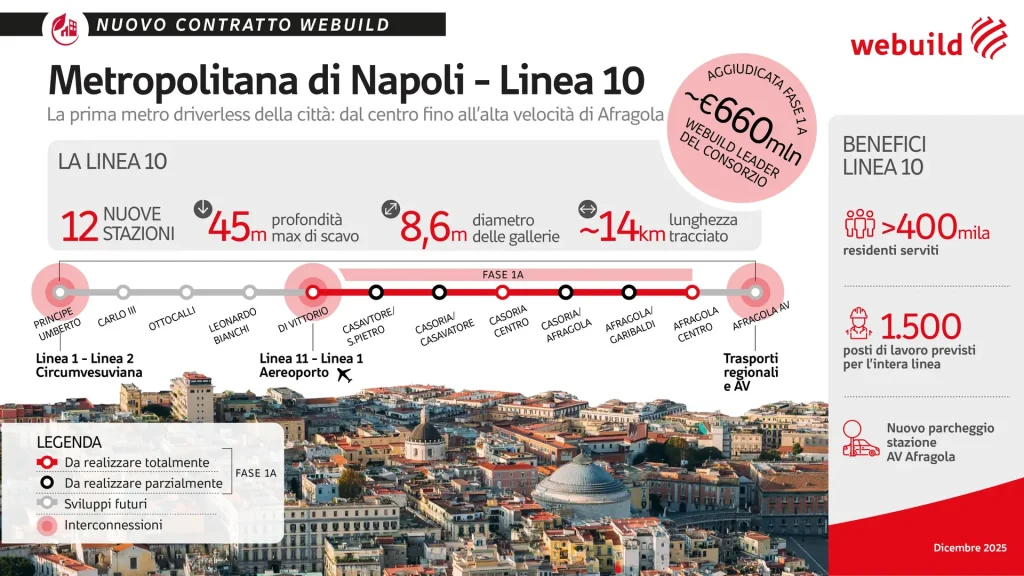 Il Lotto 1 riguarda la progettazione esecutiva e la realizzazione delle opere civili della Linea 10 che saranno eseguite per fasi. L’appalto prevede infatti circa €660 milioni, già aggiudicati, per la realizzazione di una prima tratta di 6,5 km (Fase 1A) e il diritto in esclusiva a realizzare ulteriori opere, in attesa di finanziamento, fino ad un valore totale di oltre €1,7 miliardi per il futuro completamento della linea. Per la realizzazione dei lavori della Fase 1A si stima saranno creati fino a 700 posti di lavoro, tra personale diretto e di terzi, che potranno arrivare fino a 1.500 con il futuro completamento dell’opera. Il consorzio che si è aggiudicato i lavori è composto, oltre che da Webuild, da Eteria Consorzio Stabile, Costruire, ICM e M.N. Metropolitana di Napoli.